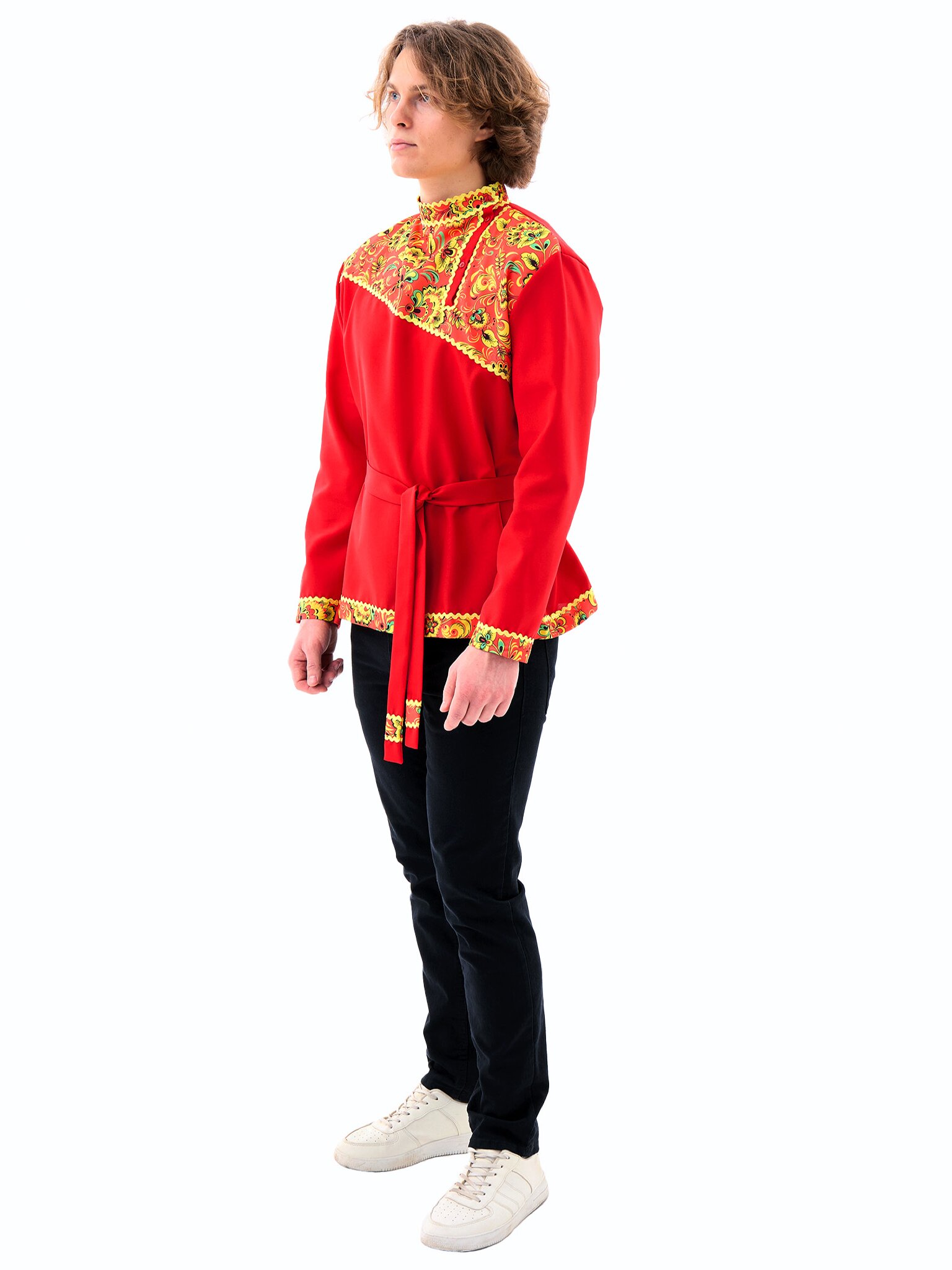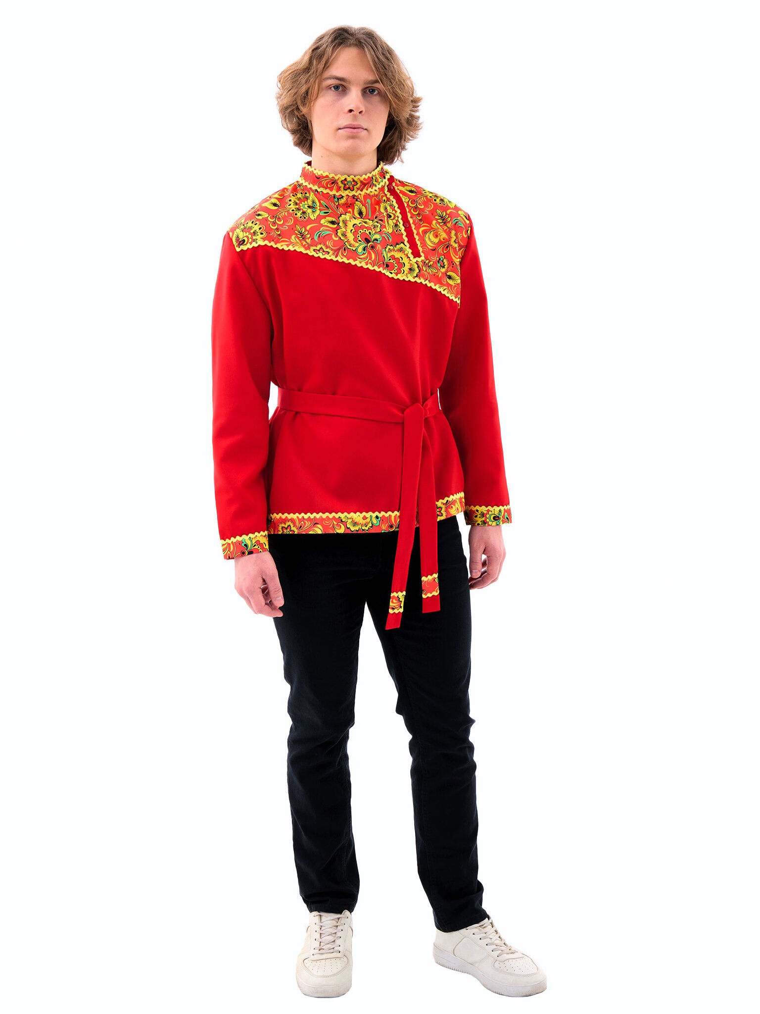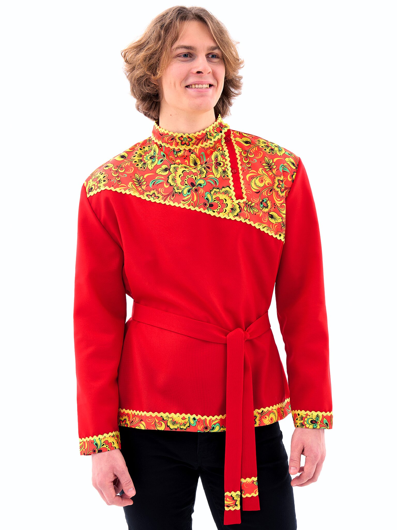 Русская народная косоворотка "Хохлома" для взрослых - яркий элемент национального костюма. Изготовлена из габардина и выполнена в красном цвете. Идеально подходит для празднования Масленицы и воплощения персонажа Иванушки. В комплект входит косоворотка и пояс.