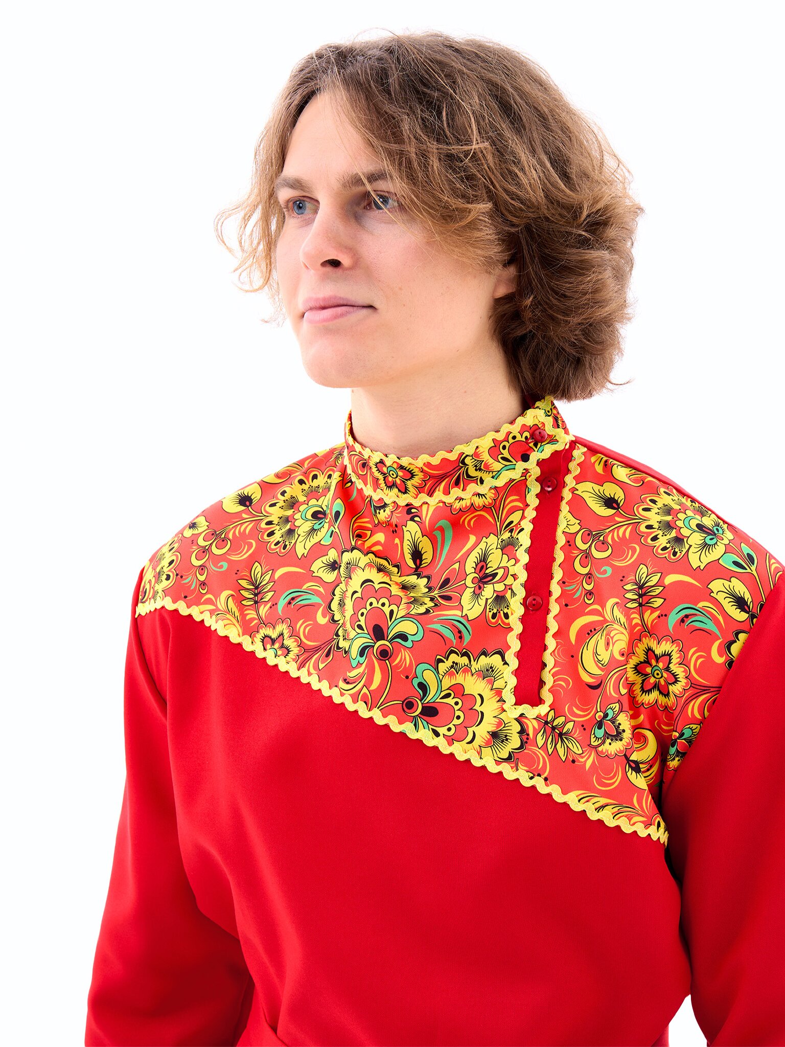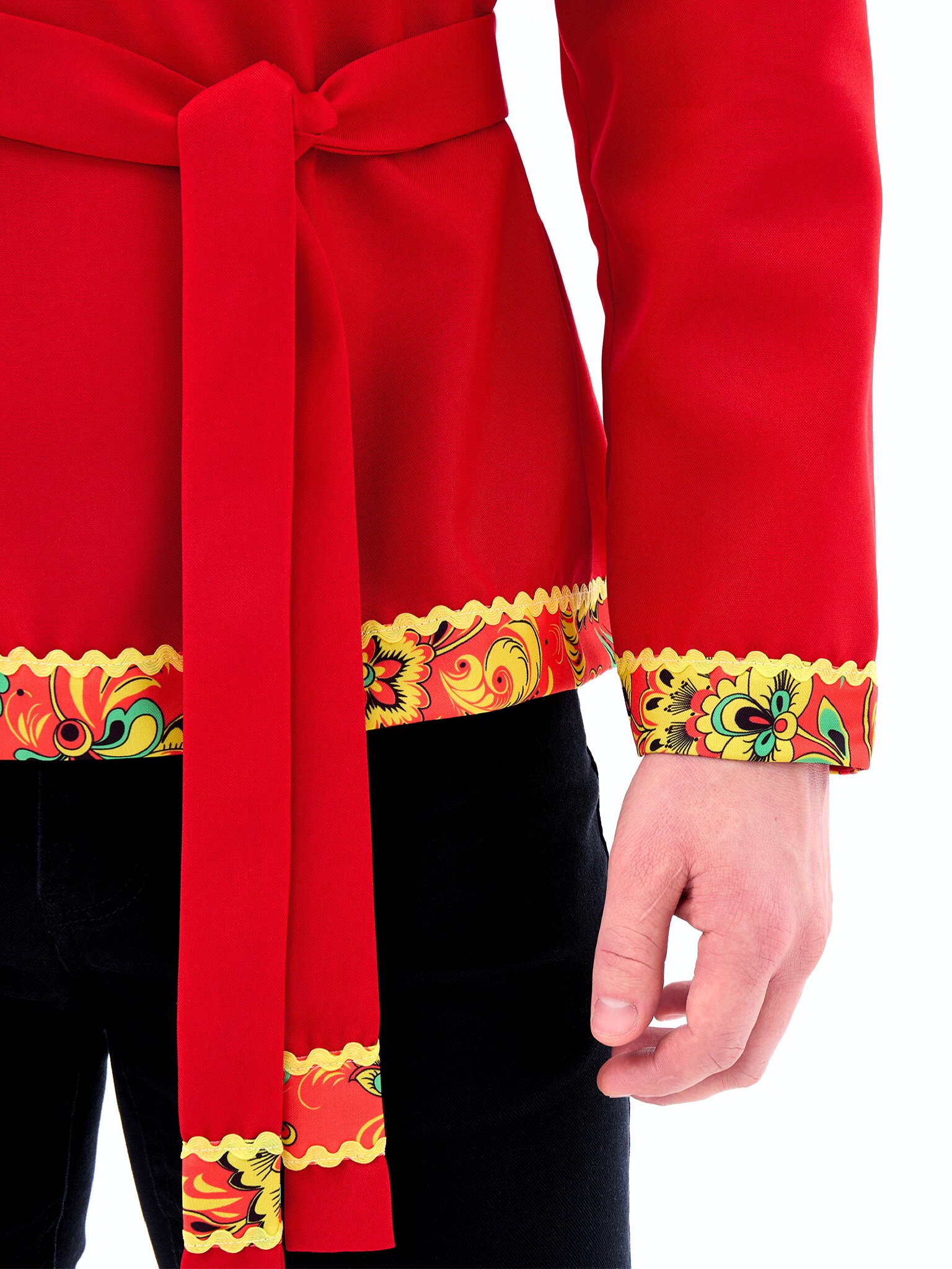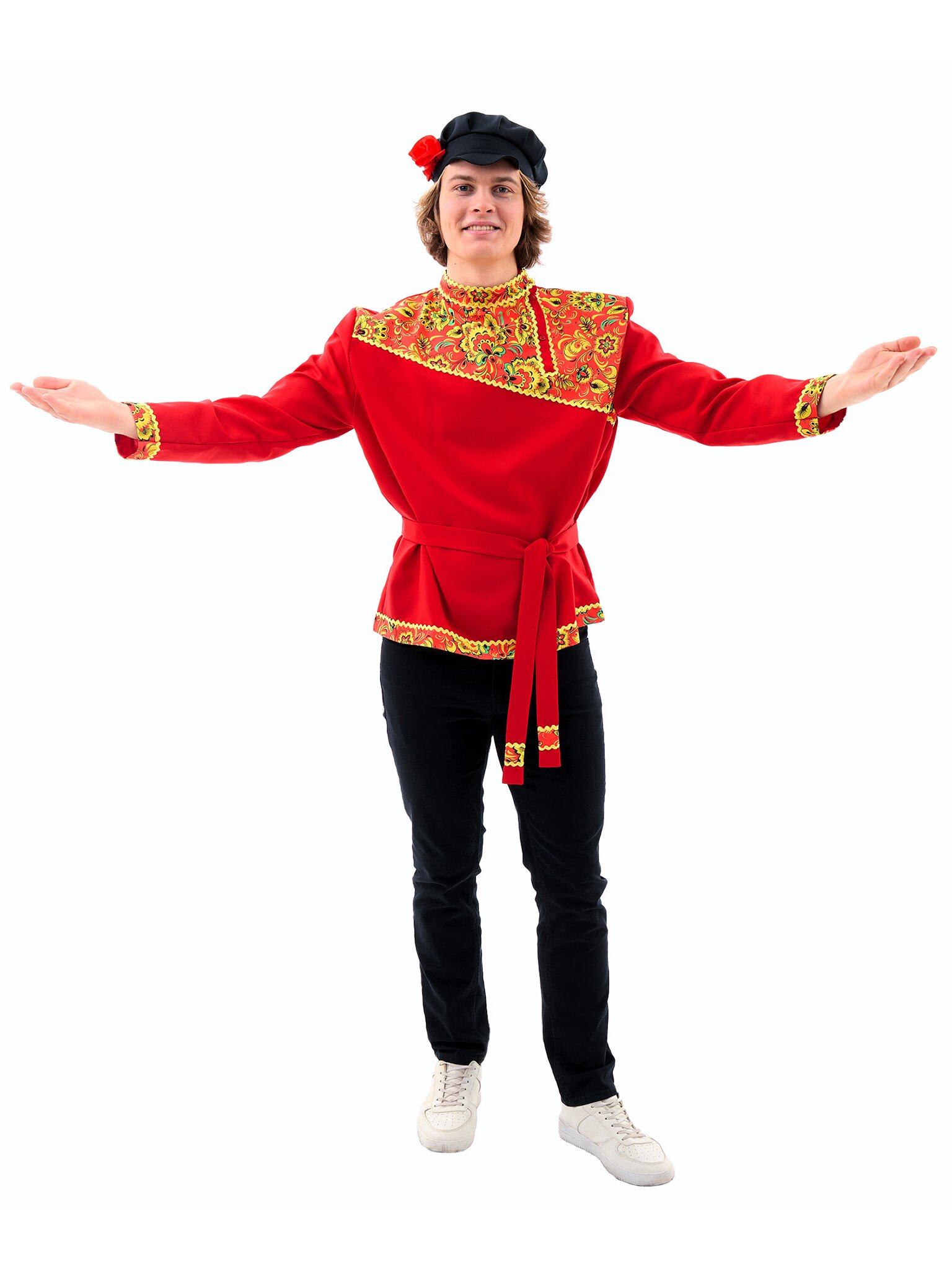 Русская народная косоворотка "Хохлома" для взрослых - яркий элемент национального костюма. Изготовлена из габардина и выполнена в красном цвете. Идеально подходит для празднования Масленицы и воплощения персонажа Иванушки. В комплект входит косоворотка и пояс.
